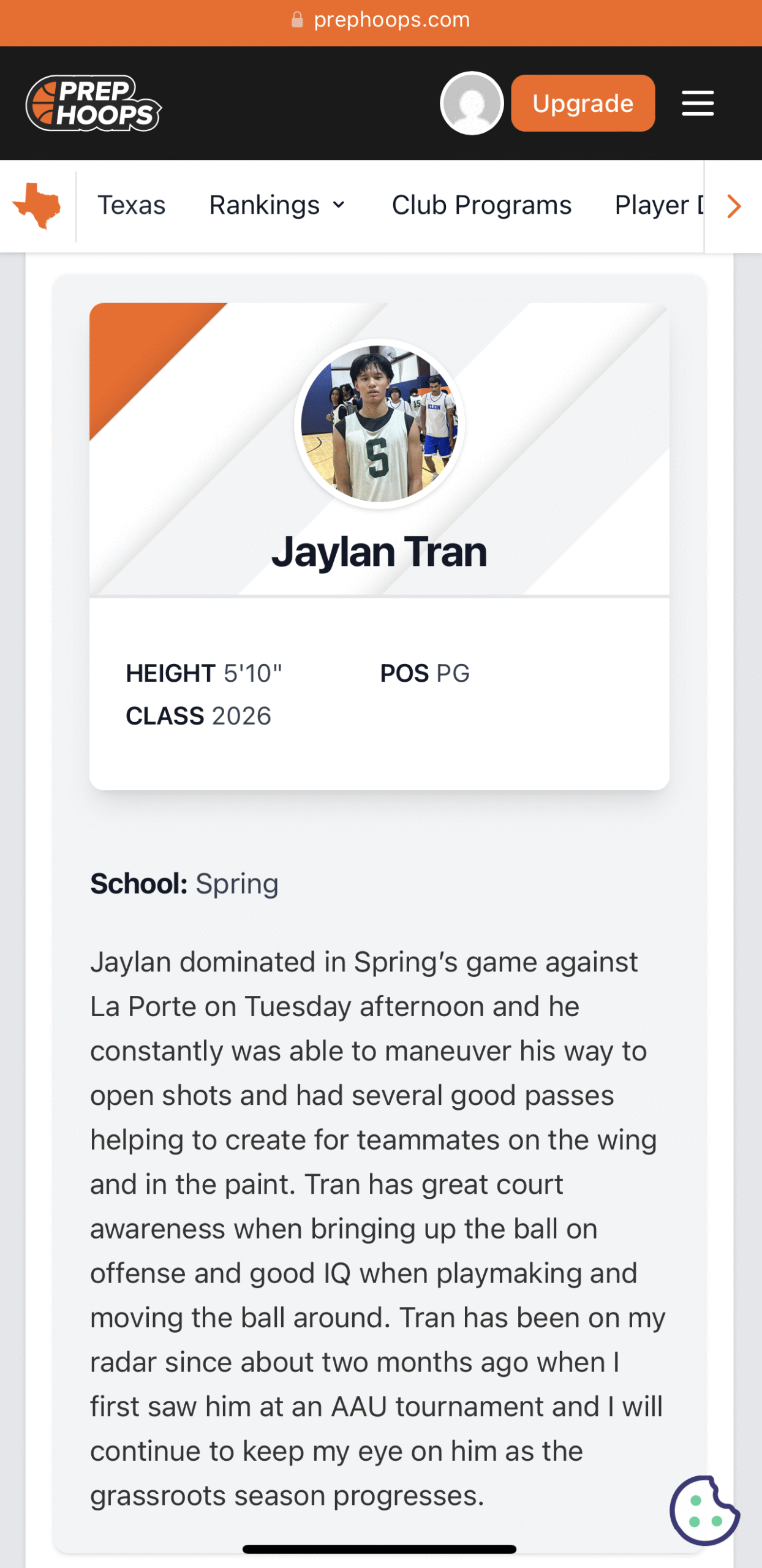 My name is Jaylan Tran, and I am the Valedictorian of the Class of 2026 at Spring High School in Houston, Texas. Academic excellence is very important to me, but basketball is my true passion. From a young age I have dedicated myself to becoming the best player I can be—constantly learning, training, and competing to improve.